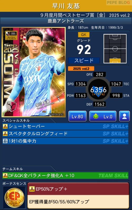 GK:グレード92 早川 友基(鹿島アントラーズ)