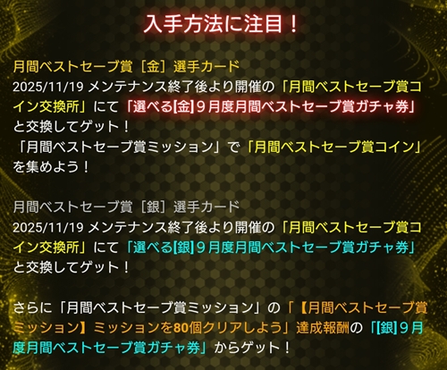 2025/11/19メンテナンス終了後より開催の「月間ベストセーブ賞コイン交換所」にて「選べる[金]9月度月間ベストセーブ賞ガチャ券」と交換でゲット可能です。
