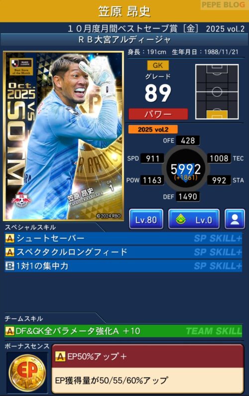 GK:グレード89 笠原 昂史(RB大宮アルディージャ)