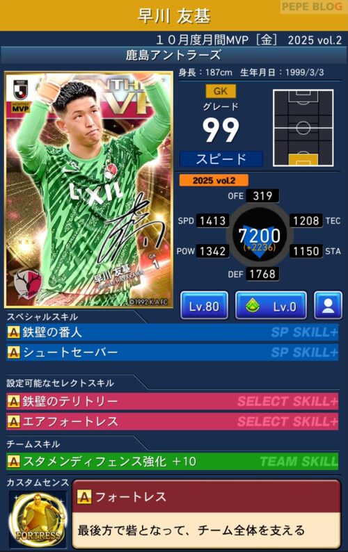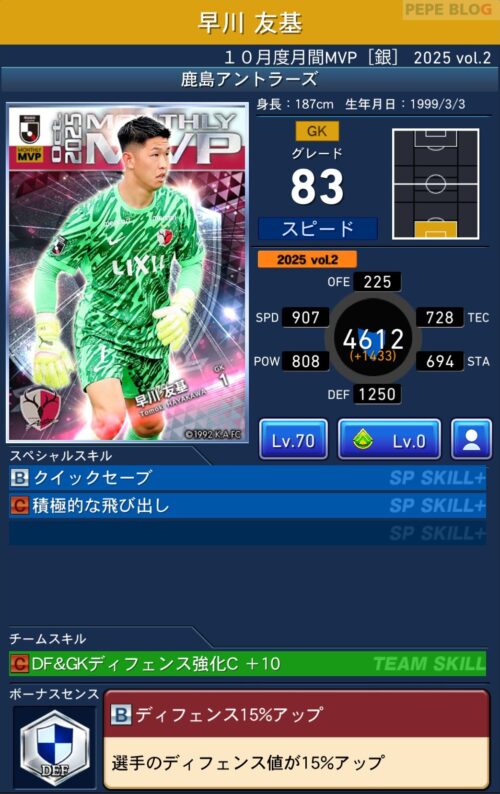 GK:グレード83 早川 友基(鹿島アントラーズ)