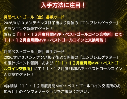 2026/01/13メンテナンス終了後より開催の「エンブレムゲッター」の累計ポイント報酬、および「11・12月度月間MVP・ベストゴールコイン交換所」にて11・12月度月間MVP・ベストゴールコインと交換でゲット!