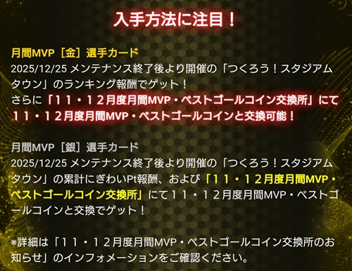 2025/12/25メンテナンス終了後より開催の「つくろう!スタジアムタウン」の累計ポイント報酬、および「11・12月度月間MVP・ベストゴールコイン交換所」にて11・12月度月間MVP・ベストゴールコインと交換でゲット!
