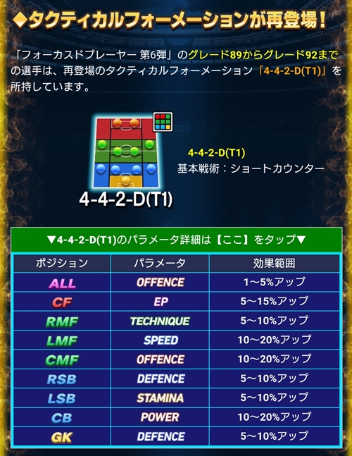 「フォーカスドプレーヤー 第6弾」のグレード89からグレード92までの選手は、「タクティカルフォーメーション 4-4-2-D(T1)」を所持しています。