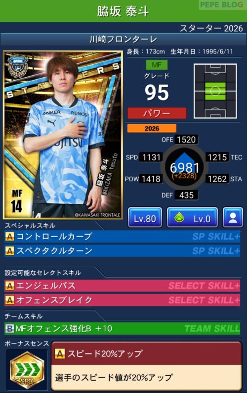 2026シーズン(2026/02/06時点)の最新データを反映した選手カードです。