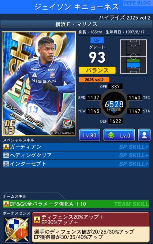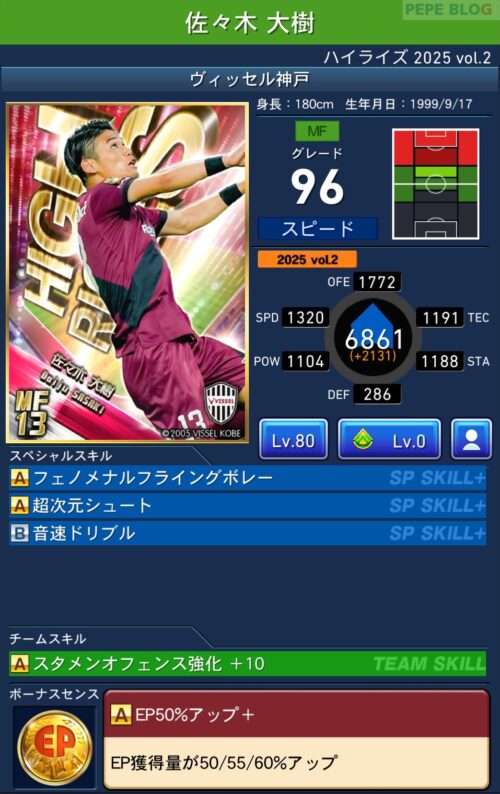 上記のピックアップ選手はボーナスセンスに「EP50%アップ+」を搭載しています。