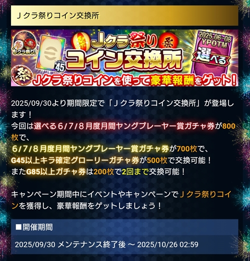 2025/09/30より期間限定で「Jクラ祭りコイン交換所」が登場!