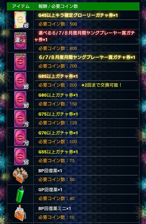 今回は「選べる 6/7/8月度月間ヤングプレーヤー賞ガチャ券」が800枚で、「6/7/8月度月間ヤングプレーヤー賞ガチャ券」が700枚で、「G45以上キラ確定グローリーガチャ券」が500枚で交換可能!