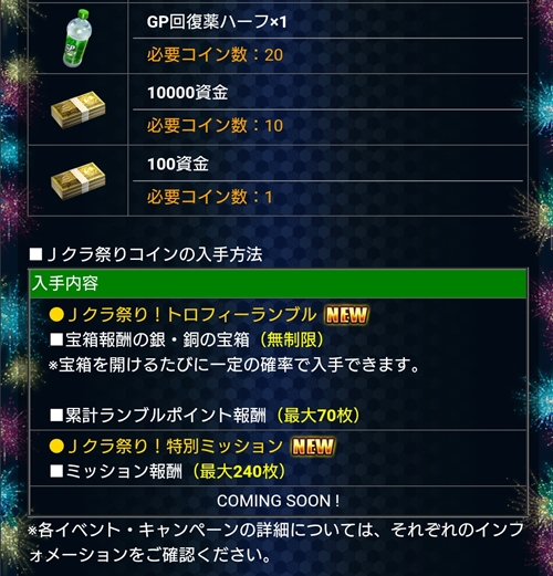 様々な条件を達成することで「Jクラ祭りコイン」や「G85以上ガチャ券」、「お気に入りクラブG75以上ガチャ券」、育成用アイテムなどが手に入ります。