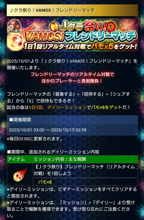 フレンドリーマッチのリアルタイム対戦を行うことで、1日1回、デイリーミッションでバモ×5をもらえる!