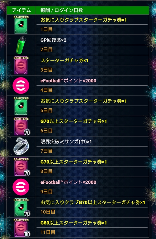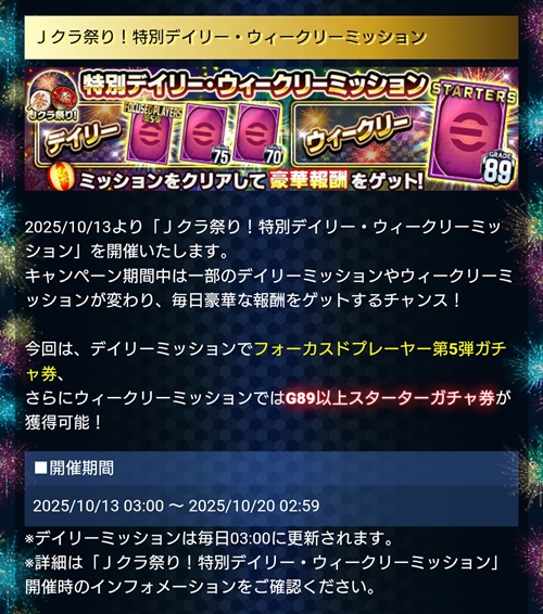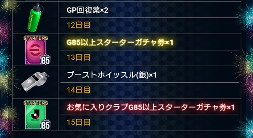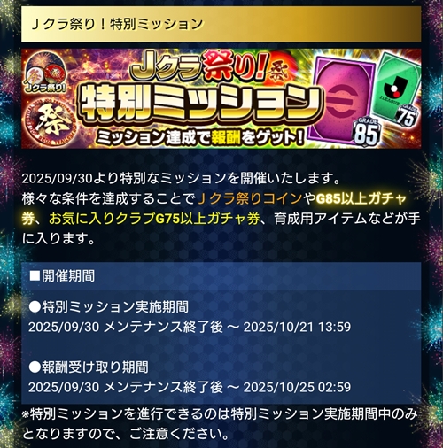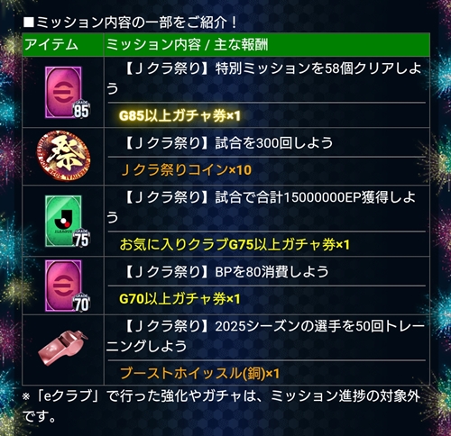 様々な条件を達成することで「Jクラ祭りコイン」や「G85以上ガチャ券」、「お気に入りクラブG75以上ガチャ券」、育成用アイテムなどが手に入ります。