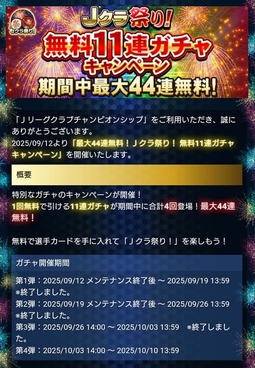 2025/09/12より「Jクラ祭り!無料11連ガチャ」を開催!