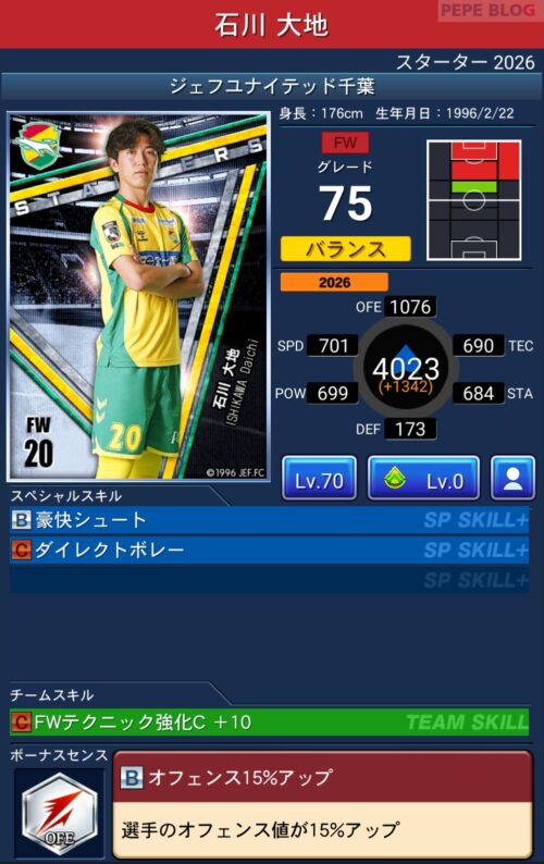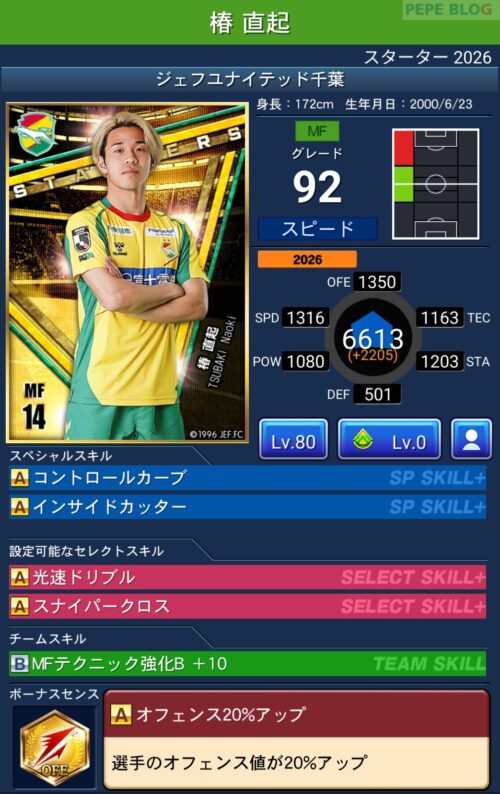 2026シーズン(2026/02/06時点)の最新データを反映した選手カードです。