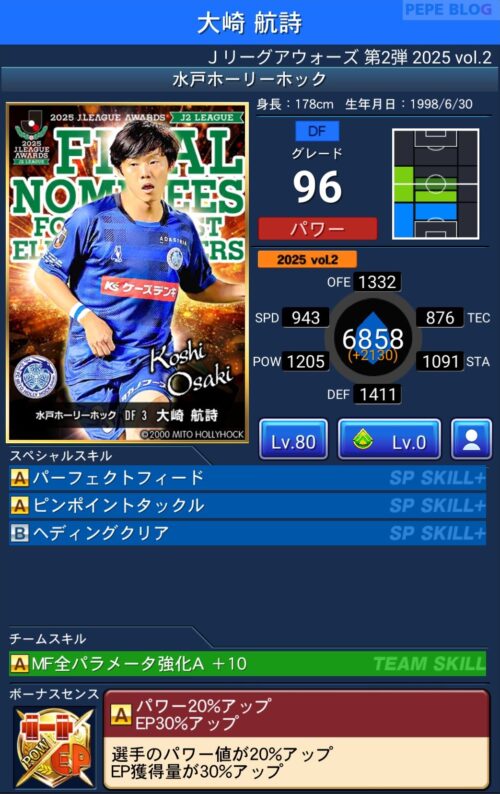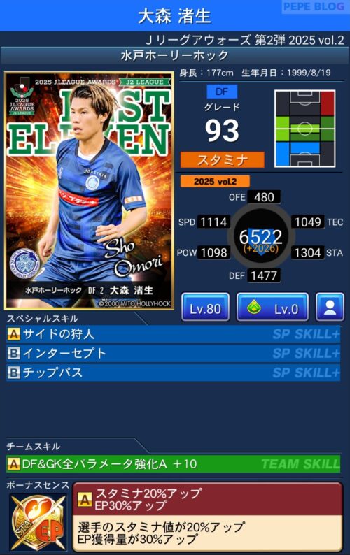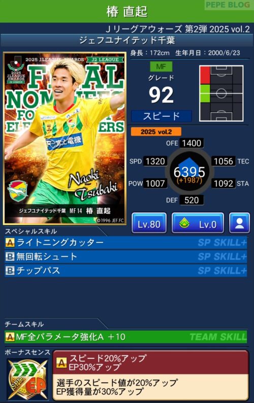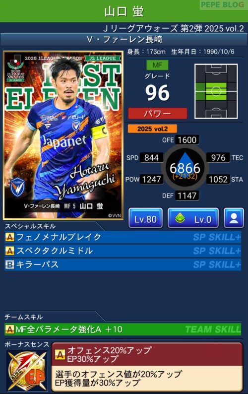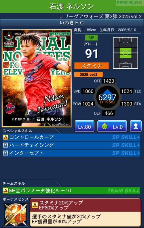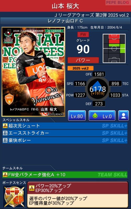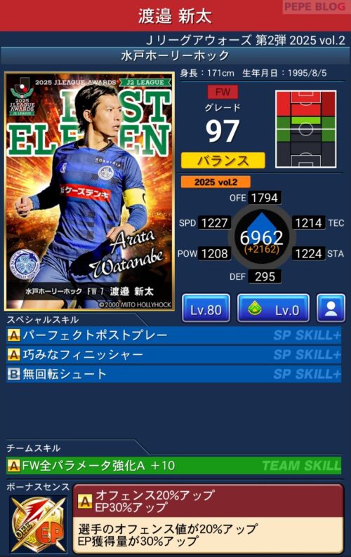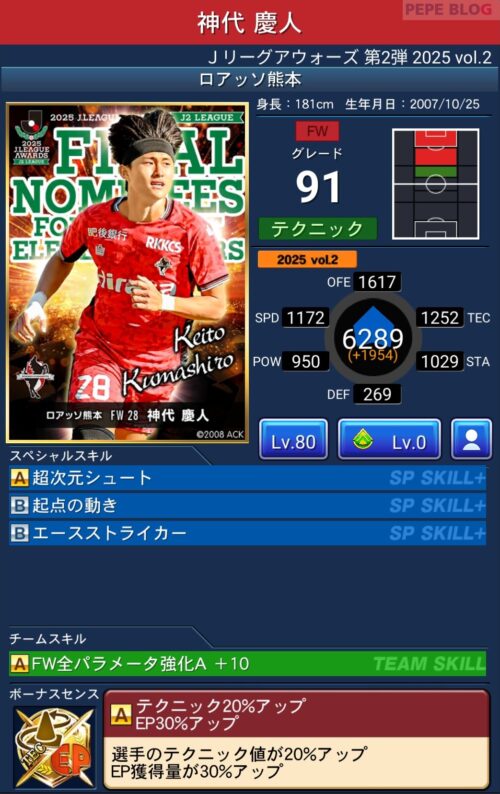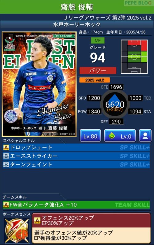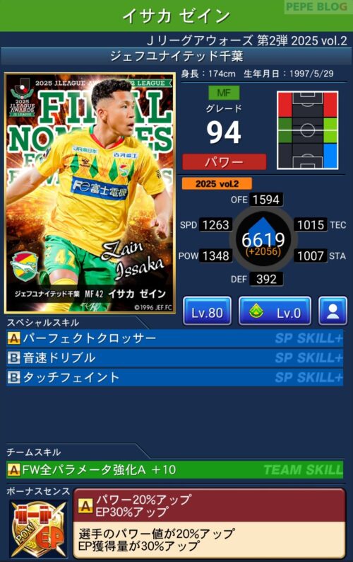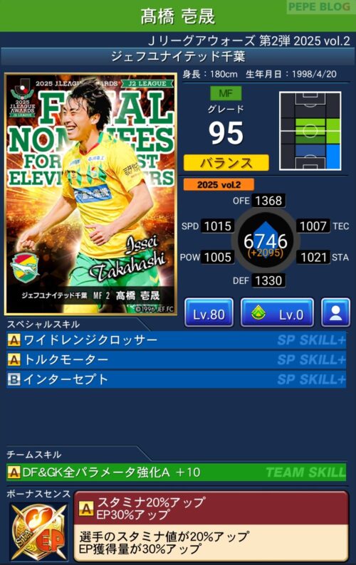 ピックアップ選手は、EP50%アップに加え、パラメーターが上昇するWセンスを所持しています。