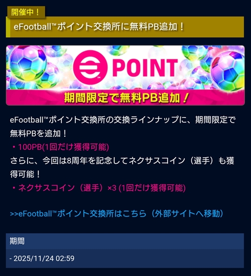 eFootball™ポイント交換所の交換ラインナップに、期間限定で無料PBを追加