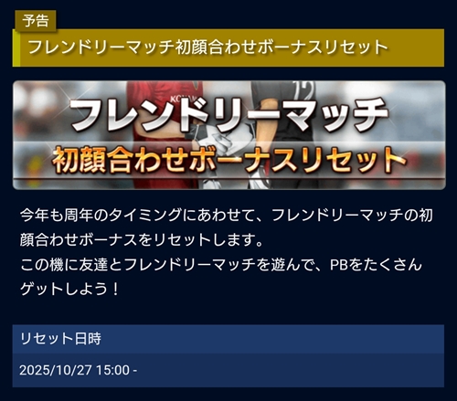 今年も周年のタイミングに合わせて、フレンドリーマッチの初顔合わせボーナスをリセット。
