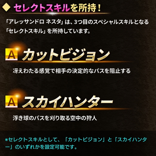 「アレッサンドロ ネスタ」は、3つ目のスペシャルスキルとなる「セレクトスキル」を所持しています。