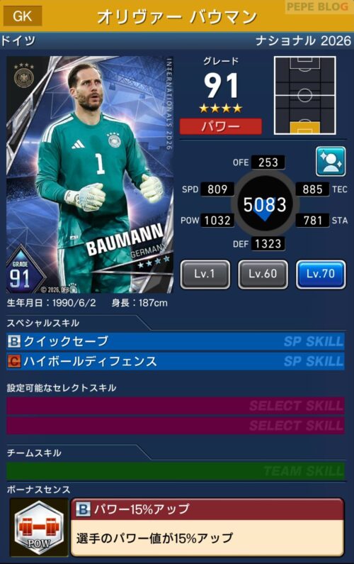 - 2.1 GK:☆4 グレード91 オリヴァー バウマン