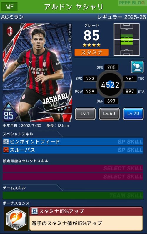 レベル3の効果は「SPスキル強化+」となっており、選手が所持しているスキルの中から一つを選び、強化をすることが可能になります。