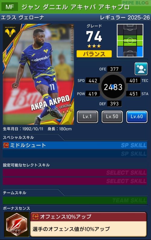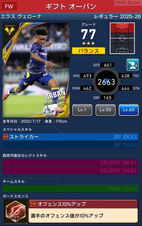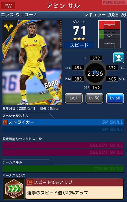 レベル3の効果は「SPスキル強化+」となっており、選手が所持しているスキルの中から一つを選び、強化をすることが可能になります。