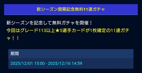 新シーズンを記念して、グレード113以上★5選手1枚確定の無料11連ガチャが開催されます。