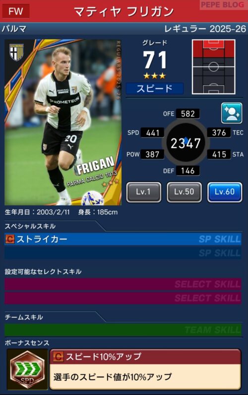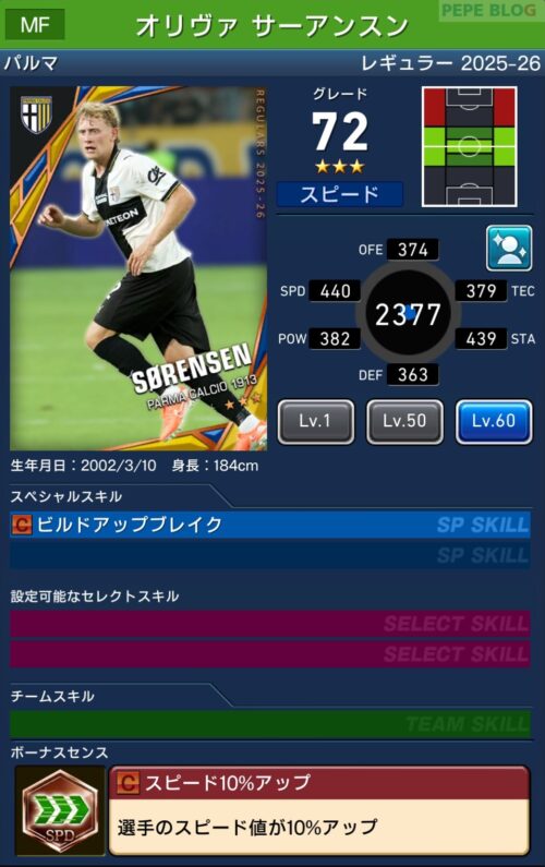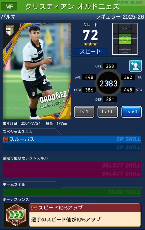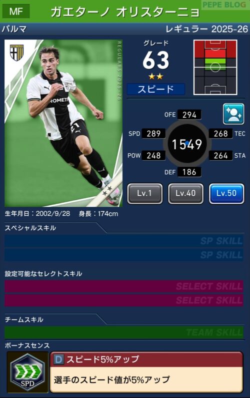 レベル3の効果は「SPスキル強化+」となっており、選手が所持しているスキルの中から一つを選び、強化をすることが可能になります。