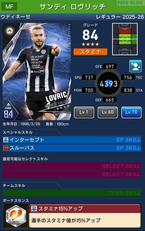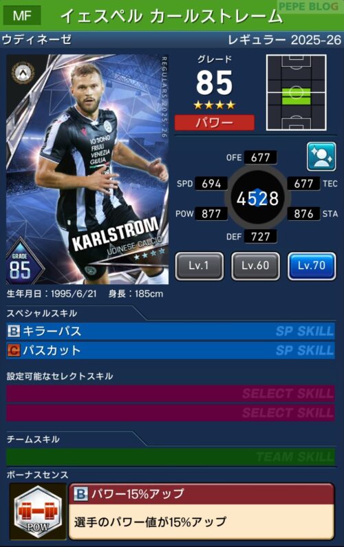 レベル3の効果は「SPスキル強化+」となっており、選手が所持しているスキルの中から一つを選び、強化をすることが可能になります。
