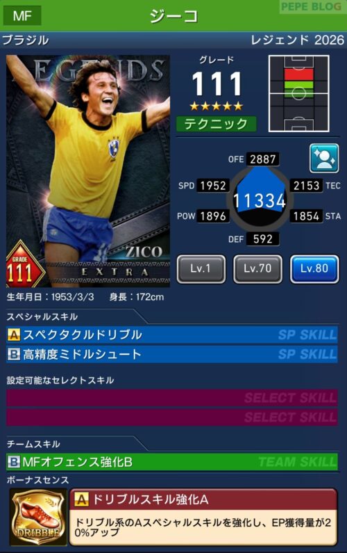 ウイコレレジェンドシリーズ2026に「ジーコ」が登場しました。