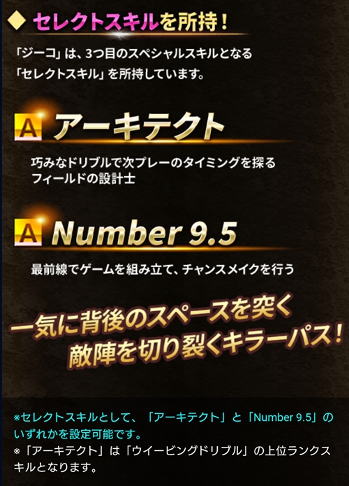 「ジーコ」は、3つ目のスペシャルスキルとなる「セレクトスキル」を所持しています。