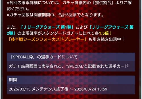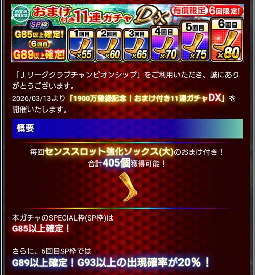 HOME > イベント > 1900万登録記念!おまけ付き11連ガチャDX 2026年3月20日 スポンサーリンク 開催日: 2026年3月13日 3:00 PM - 2026年3月24日 2:00 PMカテゴリー: 【Jクラ】ガチャ スポンサーリンク 関連コンテンツ -