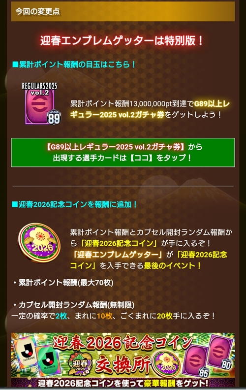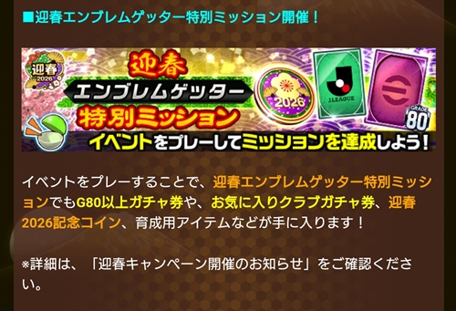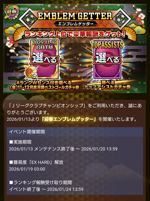 HOME > イベント > EMBLEM GETTER(エンブレムゲッター) 2026年1月15日 スポンサーリンク 開催日: 2026年1月13日 3:00 PM - 2026年1月20日 2:00 PMカテゴリー: 【Jクラ】イベント スポンサーリンク 関連コンテンツ -