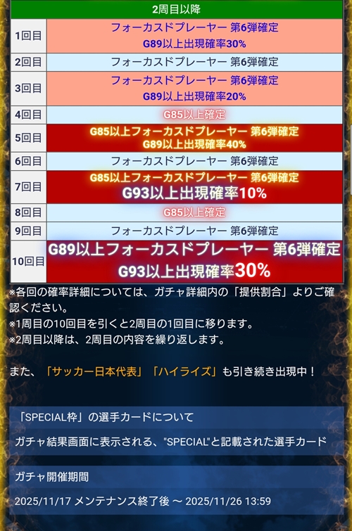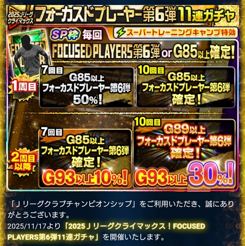 HOME > イベント > FOCUSED PLAYERS第6弾11連ガチャ 2025年11月20日 スポンサーリンク 開催日: 2025年11月17日 3:00 PM - 2025年11月26日 2:00 PMカテゴリー: 【Jクラ】ガチャ スポンサーリンク 関連コンテンツ -