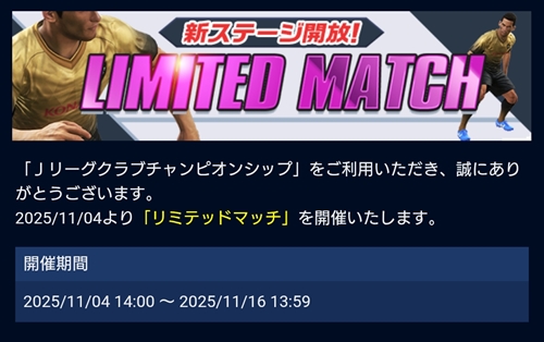 HOME > イベント > LIMITED MATCH(リミテッドマッチ) 2025年11月9日 スポンサーリンク 開催日: 2025年11月4日 2:00 PM - 2025年11月16日 2:00 PMカテゴリー: 【Jクラ】イベント スポンサーリンク 関連コンテンツ -