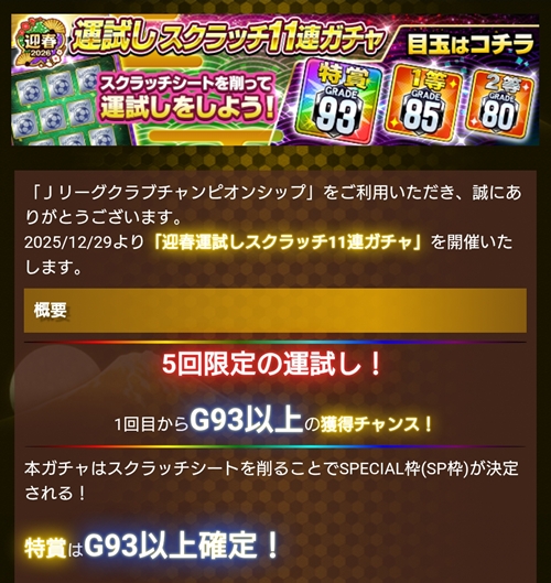 HOME > イベント > 運試しスクラッチ11連ガチャ 2025年12月29日 スポンサーリンク 開催日: 2025年12月29日 2:00 PM - 2026年1月5日 2:00 PMカテゴリー: 【Jクラ】ガチャ スポンサーリンク 関連コンテンツ -
