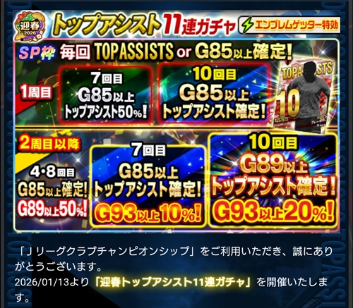 HOME > イベント > トップアシスト11連ガチャ 2026年1月15日 スポンサーリンク 開催日: 2026年1月13日 3:00 PM - 2026年1月30日 2:00 PMカテゴリー: 【Jクラ】ガチャ スポンサーリンク 関連コンテンツ -