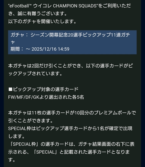 HOME > イベント > シーズン開幕記念20選手ピックアップ11連ガチャ 2025年12月13日 スポンサーリンク 開催日: 2025年12月10日 3:00 PM - 2025年12月16日 3:00 PMカテゴリー: 【ウイコレ】その他ガチャ スポンサーリンク 関連コンテンツ -