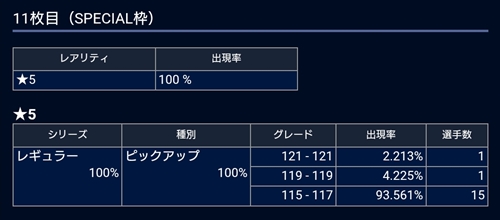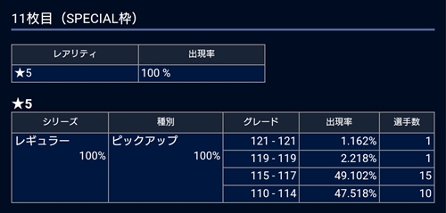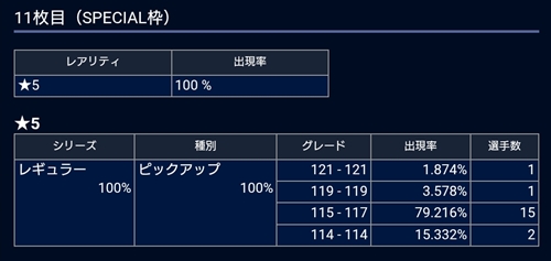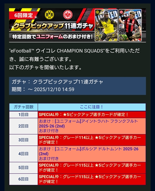 HOME > イベント > 6回限定クラブピックアップ11連ガチャ 2025年12月9日 スポンサーリンク 開催日: 2025年12月5日 - 2025年12月10日カテゴリー: 【ウイコレ】その他ガチャ ■1回目:★5ピックアップ確定! ■2回目/4回目:★5確率5% ■3回目:グレード114以上★5ピックアップ確定! ■5回目/6回目:グレード115以上★5ピックアップ確定! スポンサーリンク 関連コンテンツ -