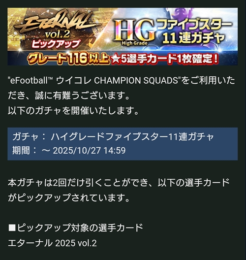 HOME > イベント > HGファイブスター11連ガチャ 2025年10月23日 スポンサーリンク 開催日: 2025年10月23日 3:00 PM - 2025年10月27日 3:00 PMカテゴリー: 【ウイコレ】その他ガチャ スポンサーリンク 関連コンテンツ -