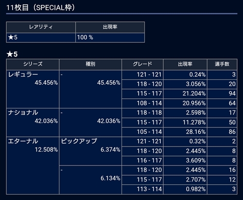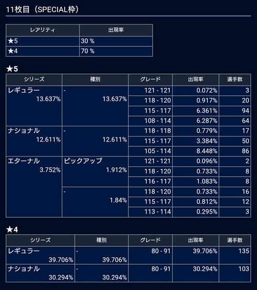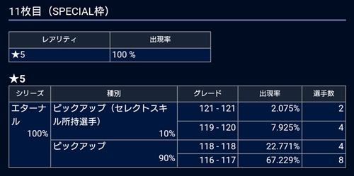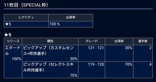 HOME > イベント > エターナル2025 vol.3 ピックアップ11連ガチャ 2025年12月17日 スポンサーリンク 開催日: 2025年12月16日 4:00 PM - 2025年12月31日 3:00 PMカテゴリー: 【ウイコレ】ピックアップ11連ガチャ ■初回1回目/初回3回目:SP枠 ★5確定! ■2回目/4回目/6回目/8回目:SP枠 ★5ピックアップ確定!セレクトスキル所持選手出現率10% ■5回目/7回目/9回目:SP枠 ★5出現率30% ■初回10回目:SP枠 セレクトスキル所持★5ピックアップ確定!カスタムセンス+所持★5ピックアップ出現率30% スポンサーリンク 関連コンテンツ -