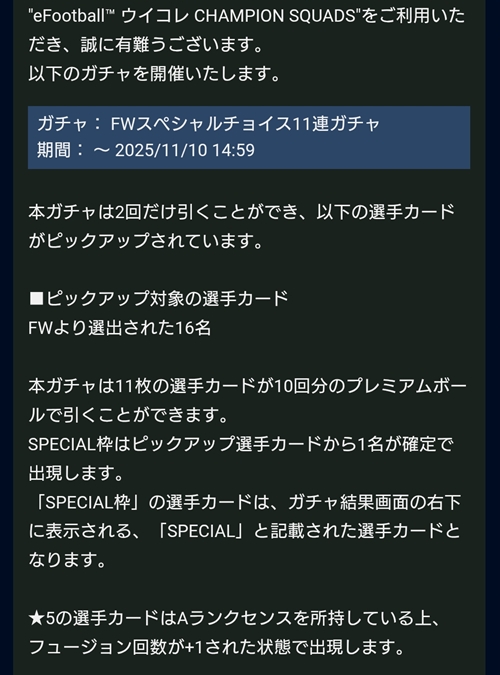 HOME > イベント > タイタンズリーグ直前FWスペシャルチョイス11連ガチャ 2025年11月7日 スポンサーリンク 開催日: 2025年11月4日 3:00 PM - 2025年11月10日 3:00 PMカテゴリー: 【ウイコレ】その他ガチャ スポンサーリンク 関連コンテンツ -